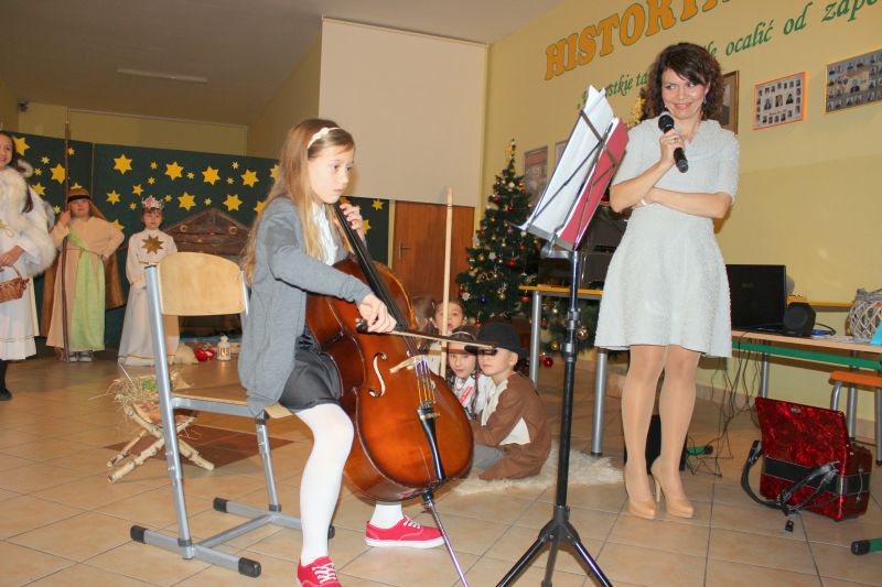 Piątek 19 grudnia był ostatnim dniem nauki przed przerwą świąteczną. Z okazji nadchodzących Świąt Bożego Narodzenia samorząd uczniowski wraz z opiekunem p. Joanną Sosin, we współpracy z p. E. Pyzik oraz nauczycielami nauczania zintegrowanego przygotował przedstawienie jasełkowe oraz quiz muzyczny pt. Jaka to kolęda. Swoje umiejętności recytatorskie zaprezentowały dzieci młodsze, nie mogło zabraknąć również pięknych świątecznych piosenek w wykonaniu szóstoklasisów. Następnie odbył się konkurs, który polegał na rozpoznaniu kolędy lub pastorałki po wysłuchaniu jej melodii. Utwory zagrane zostały przez uczniów oraz nauczycieli naszej szkoły na kontrabasie, wiolonczeli, saksofonie, akordeonie i flecie poprzecznym. Spotkanie zakończyło się wręczeniem nagród uczestnikom konkursu na najpiękniejszy świąteczny stroik.