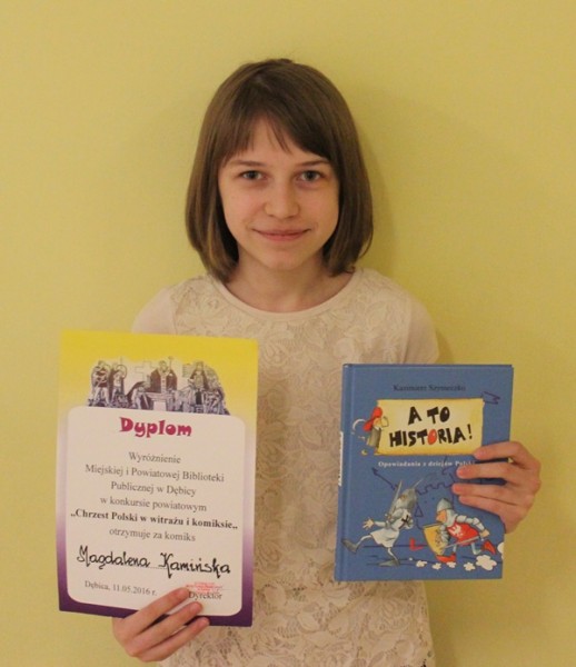 MAGDALENA KAMIŃSKA zdobyła wyróznienie w Powiatowym Konkursie “Chrzest Polski w witrażu i komiksie” organizowanym przez Miejską i Powiatową Bibliotekę Publiczną w Dębicy. Magda jest autorką, pełnego humoru, komiksu o chrzcie Polski.