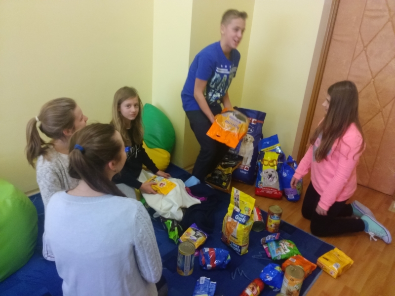 Dzięki wrażliwości całej społeczności szkolnej i zaangażowaniu SKW „Razem dla innych” udało nam się zebrać prawie 70 kg karmy i trzy koce i inne przedmioty dla psiaków i kociaków.