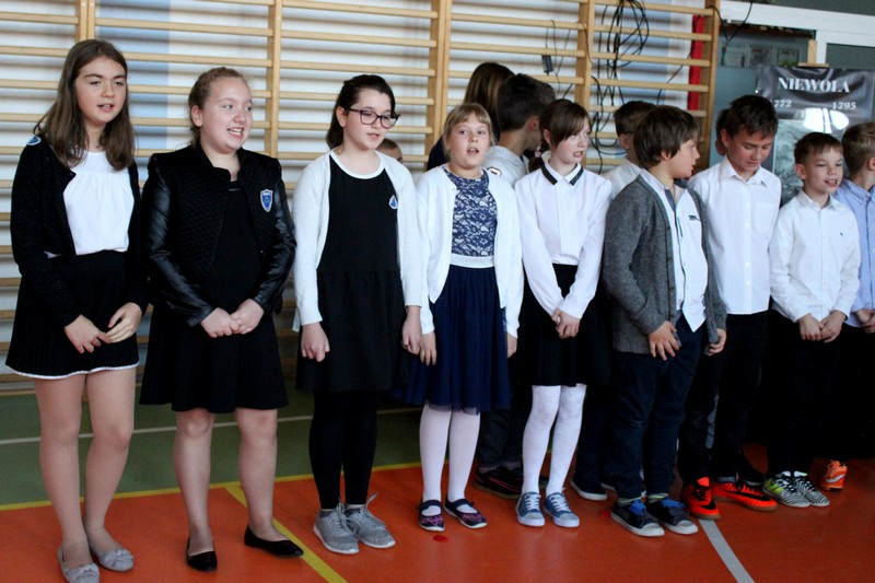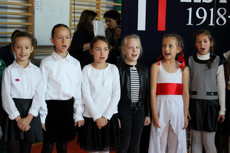 I tak: klasy pierwsze zaśpiewały piosenkę pt. “Od morza aż do Tatr”, klasy drugie – “Przybyli ułani”, klasa trzecia zaprezentowała pieśń pt. “Pierwsza brygada”, klasy czwarte -“Wojenko, wojenko”, Piątoklasiści – “Piechotę”, klasy szóste wyśpiewały pieśń “Rozkwitały pąki białych róż”, klasy siódme -“O mój rozmarynie”, a najstarsi uczniowie odspiewali “Rotę”.
