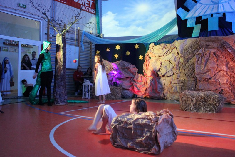 W czwartek 20 grudnia w naszej szkole odbyły się Jasełka Bożonarodzeniowe. Młodzi aktorzy z klasy trzeciej i świetlicy szkolnej w formie pantomimy opowiedzieli o stworzeniu świata, pierwszych ludziach, ich grzechu, wygnaniu z raju i tęsknocie za Bogiem. Przedstawili Zwiastowanie i Narodzenie Jezusa w Betlejem. Muzycznego charakteru widowisku nadały kolędy scholi „Serduszka”.