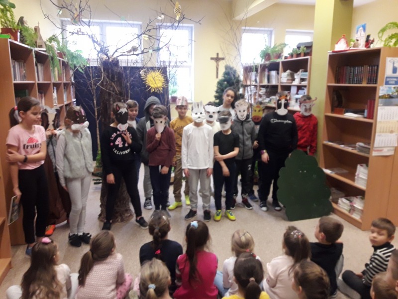 28 lutego w bibliotece szkolnej uczniowie klasy 4a przedstawili przegotowaną inscenizację bajki,, Przyjaciele” Ignacego Krasickiego. Na zajęciach języka polskiego uczniowie podzieleni na dwie grupy ćwiczyli pamięciowe opanowanie roli, dykcję i ruch sceniczny. W przedstawienie oglądały dzieci z oddziału zerowego pod opieką pani Iwony Lawery- Bal i uczniowie klasy pierwszej pod opieką pani Katarzyny Lechowicz.