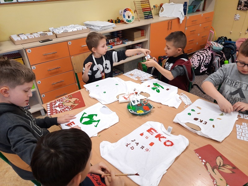 Druga część zajęć z serii „Myślę globalnie – działam lokalnie”, które odbyły się we wtorek 08 lutego 2022 r., była dla dzieci z klasy 1b i 2b okazją do spróbowania swoich sił w projektowaniu ekologicznych koszulek. Dzięki ich pomysłowości i wytrwałości powstały ekologiczne stylizacje.