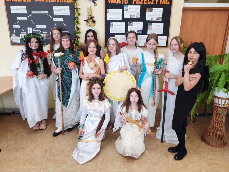 Uczniowie klas piątych na lekcji j. polskiego przenieśli się do starożytnej Hellady – na górę Olimp. Tam, według wierzeń starożytnych Greków mieli zamieszkiwać bogowie. Ucztę rozpoczęła najpiękniejsza i najważniejsza para bogów: Zeus i Hera. Następnie każdy z uczniów, delektując się przygotowanymi smakołykami, miał szansę zaprezentować ciekawostki na temat wybranego przez siebie boga greckiego. Dzieci wykazały się pomysłowością i twórczym podejściem do tematu. Zabawa była przednia….