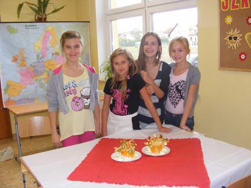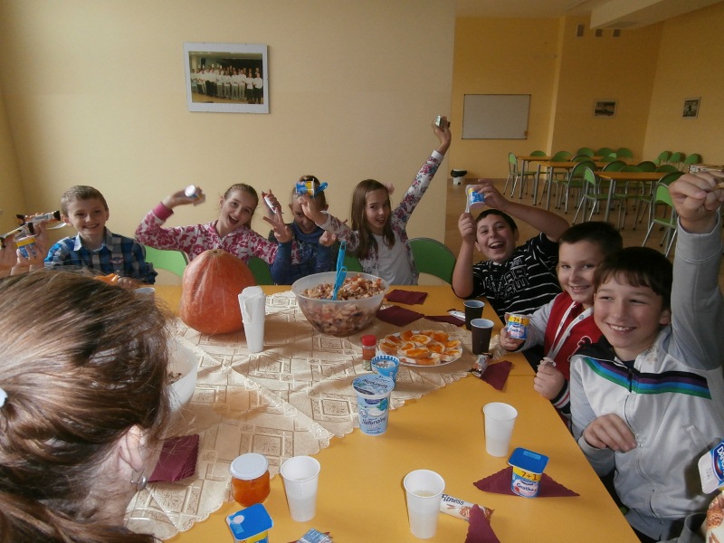 W wybranym przez klasę dniu odbyła się zabawa w kucharzy. Każda klasa otrzymała od firmy Danone 50 zł na zakup produktów, z których przygotowała „OWOCOWE LUB JARZYNOWE CUDO!” W realizację zadania włączyli się chętni rodzice uczniów, którzy doradzali dzieciom co wykonać, pomogli wybrać przepisy oraz przygotować potrawy.